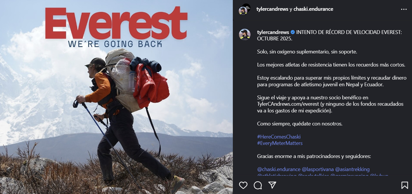 Tyler Andrews vuelve este otoño a Everest con un objetivo claro: romper el récord de ascenso sin oxígeno (Explorersweb), fijado en 1998 por Kazi Sherpa (20h24m). Tras tres intentos fallidos en primavera, el ultrarunner estadounidense apuesta por una ventana más solitaria, fría y técnica, con solo una docena de personas en la montaña. Escalará sin sherpa personal, con asistencia mínima en el Campo 4 y usando cuerdas fijas en la vertiente nepalí, en estilo rápido, ligero y sin margen para errores. Renuncia al UTMB para centrarse en esta nueva tentativa. “Sé que puedo lograrlo, solo necesito que todo se alinee”, afirma Andrews. Esta vez no habrá multitudes ni segundas oportunidades. Solo Everest, el reloj… y él.
