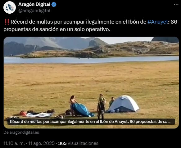 Multa récord en el Ibón de Anayet: 86 sanciones en un solo fin de semana por acampadas ilegales a menos de 100 metros del agua (elDiario). La Guardia Civil y los APNs localizaron 46 tiendas no autorizadas en este espacio natural protegido, algunas promovidas por empresas sin permisos. El auge de visitantes, impulsado por redes sociales, está provocando un deterioro ecológico alarmante en uno de los rincones más frágiles del Pirineo. Ni las pernoctas fueron comunicadas al 112 ni se respetaron las mínimas normas de seguridad ambiental. Colectivos ecologistas y autoridades insisten: los ibones no son un “spot” de Instagram, son ecosistemas únicos que urge proteger.