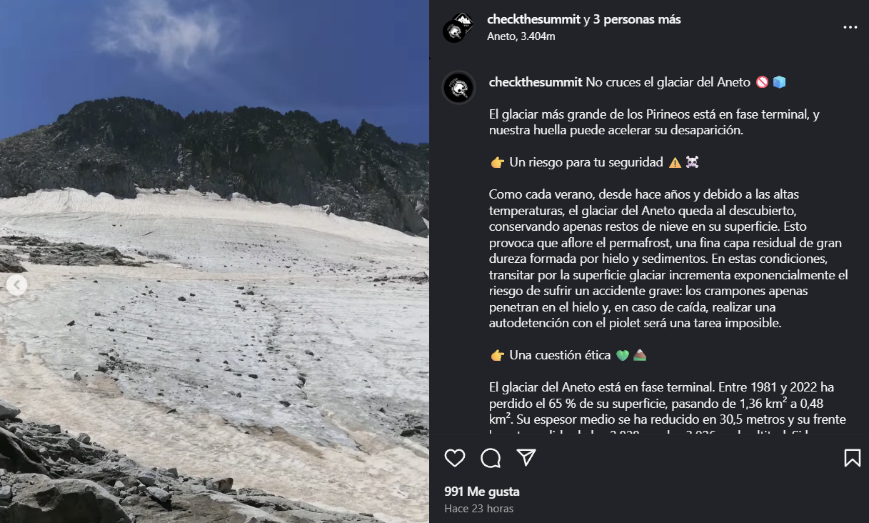 Masificación, imprudencia y caos en el Aneto: la cara B del techo del Pirineo (Cadena Ser). Cada verano se repite la escena: montañeros sin crampones ni casco bajando por neveros expuestos, colas de 30 minutos en el Paso de Mahoma y rescates evitables. Mientras el glaciar del Aneto se deshace, la alta montaña se convierte en parque temático sin conciencia del riesgo real.