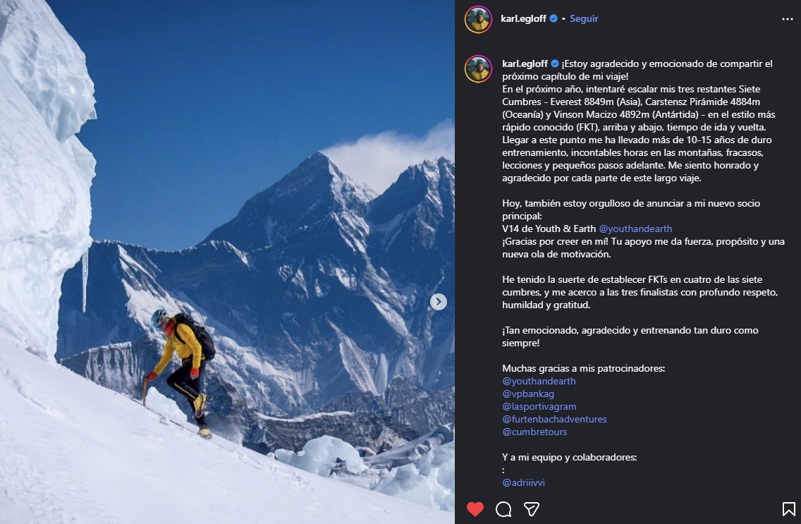 Karl Egloff volverá al Monte Everest en la primavera de 2026 para intentar de nuevo el FKT en ida y vuelta sin oxígeno (Explorersweb), desde el Campo Base hasta la cima y regreso, en estilo autosuficiente. A diferencia de otros aspirantes como Tyler Andrews, centrado en el ascenso, Egloff defiende que un récord de velocidad en alpinismo debe completar el recorrido completo. Tras abortar su intento en 2025 y superar un periodo de desgaste mental, el ecuatoriano prepara ahora una aclimatación específica en el Khumbu, con entrenamiento hipóxico previo y el apoyo logístico de Furtenbach Adventures, acompañado de Nico Miranda.