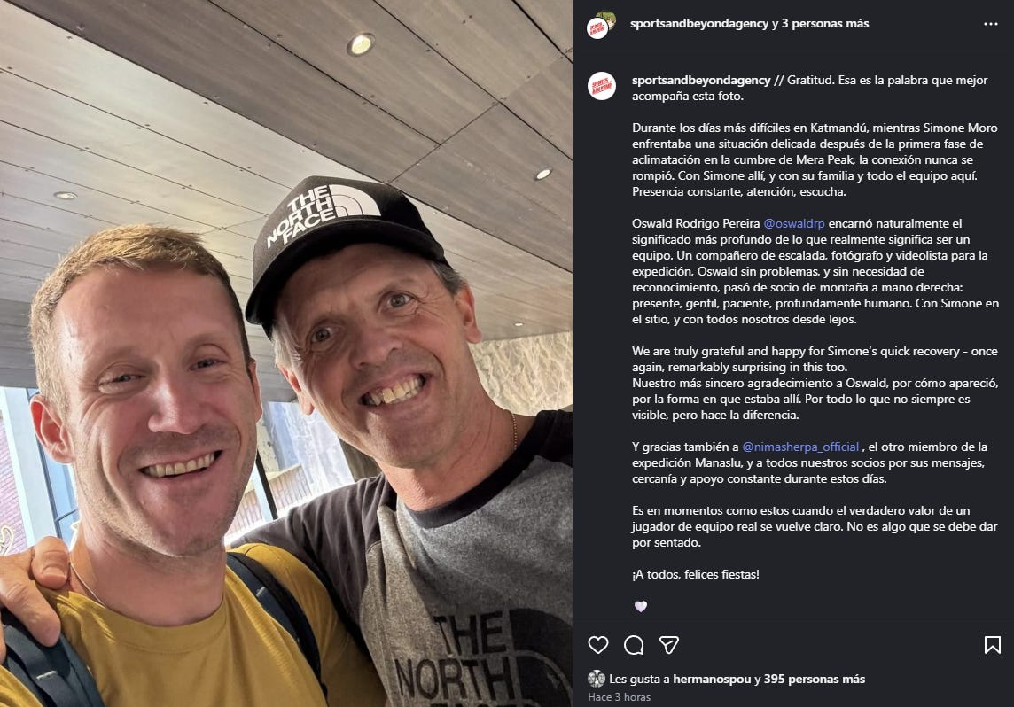 Simone Moro ha explicado en un vídeo que sufrió un infarto a unos 5.000 m de altitud, en el campo base de Khare, bajo el Mera Peak, y que fue tratado de urgencia en un hospital de Katmandú (Desnivel). Tras una noche completa con dolor en altura y una evacuación retrasada, los médicos limpiaron una arteria coronaria bloqueada sin bypass ni stent, y su evolución es positiva. A sus 58 años, el alpinista asegura que podrá “volver a hacer lo que quiera” tras la recuperación y el chequeo en Italia. El episodio le obliga, eso sí, a renunciar al intento invernal al Manaslu, cuando se encontraba en plena fase de aclimatación.