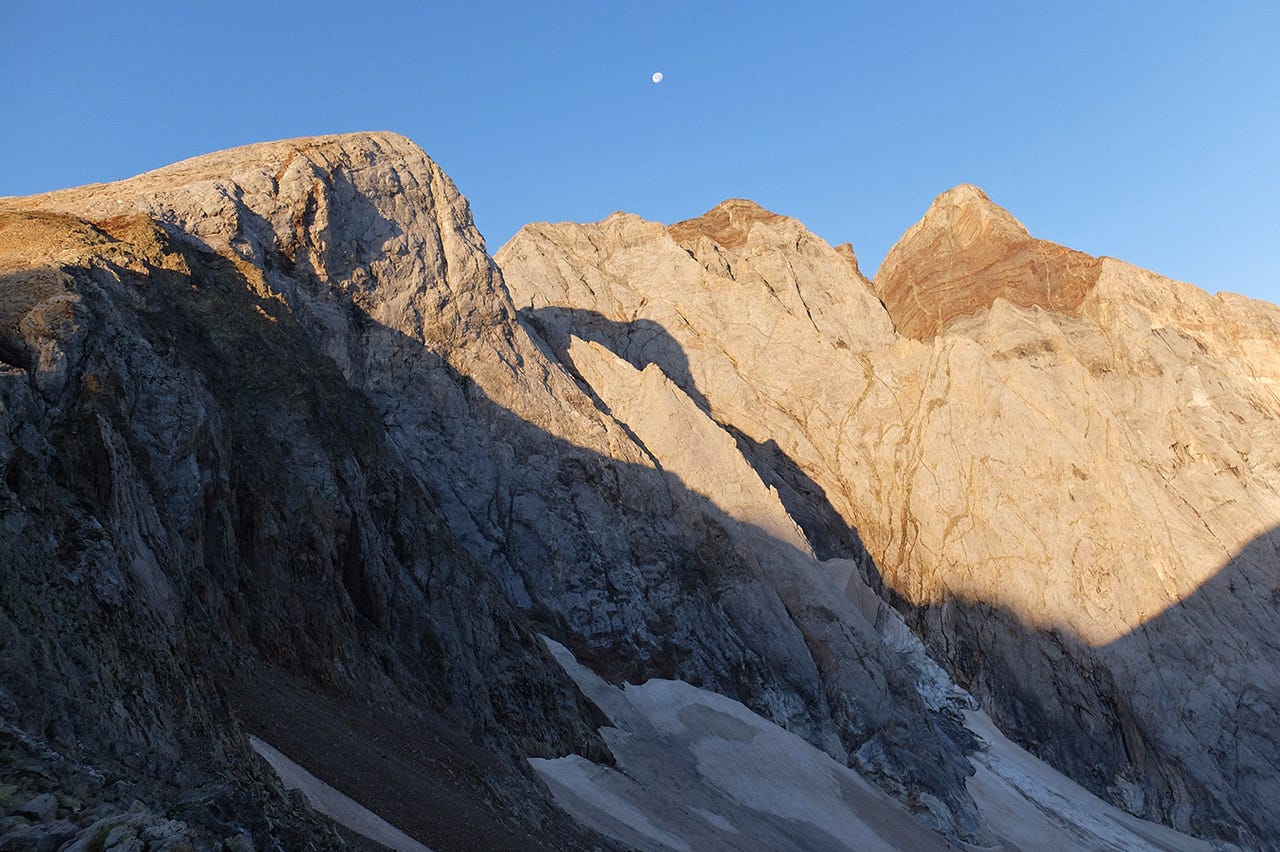 Pues ni más ni menos que el perfil noreste del macizo de Vignemle, visto desde la subida al Petit Vignemale. En primer plano, a la izquierda, aparece el Petit Vignemale (3.032 m), seguido de la Espalda Chausenque (3.154m) y la Punta Chausenque (3.204m). El Pitón Carré (3.197m) despunta tímidamente antes de la Brecha de Gaube y, a continuación, el Gran Vignemale o Pique Longue (3.296m).