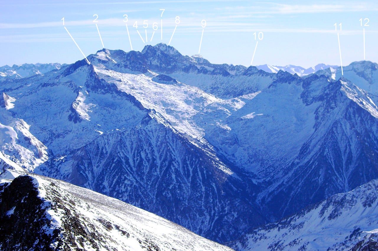 Con el número 1 aparece el más occidental de los tresmiles principales del macizo.