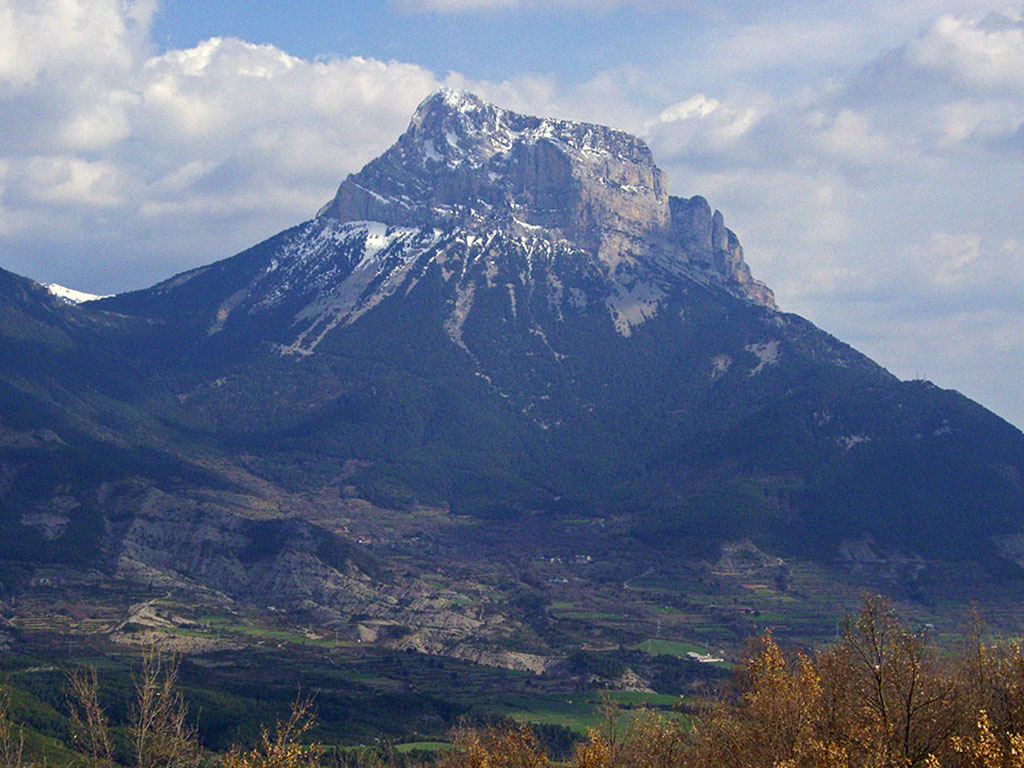 2) Su posición retrasada respecto al eje pirenaico, unido a lo abrupto de su relieve, hacen visible a esta montaña desde cualquier parte y la convierten en un auténtico faro de las tierras bajas de esta comarca.