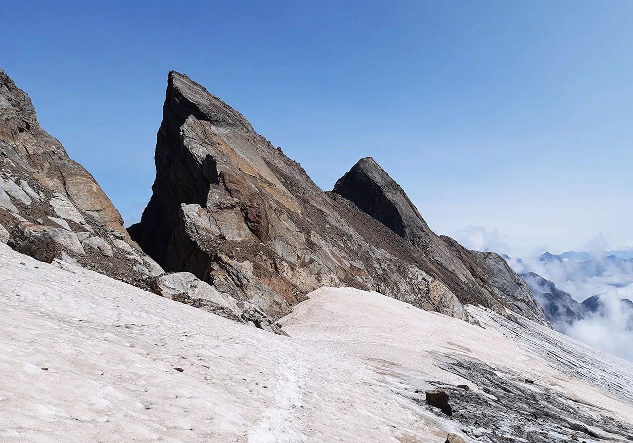 La afilada punta que veíamos en la fotografía era el Pitón Carré (3.197m), la segunda cumbre más elevada del Pirineo, enteramente en territorio francés, tras la Punta Chausenque (3.204m), a la derecha de la fotografía. Respecto a las demás pistas, la brecha que veíamos a sus pies era la brecha de Gaube, la salida del couloir más prestigioso del Pirineo; y el glaciar era el de Ossoue, que con cerca de 37 ha se sitúa como el tercer glaciar por extensión del Pirineo y el único con lengua.